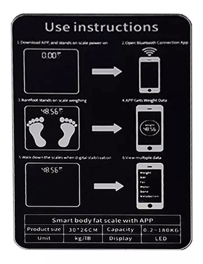 Balanza Digital inteligente Bluetooth, Ideal para controlar el peso corporal adecuado que mide hasta 180kg, Esta balanza tiene la particularidad que tambien posee un sistema de lectura mas precisa que los convencionales, ya que este registra tu peso corporal y te da una estadistica de cual es tu peso ideal, grasa corporal, agua, IMC, masa muscular, masa ósea, grasa visceral y proteína, hasta 15 detalles de datos. Caracteristicas - Material: plataforma de vidrio templado- Color: Negro- Dimensión: 260x260x21mm- Pantalla: retroiluminación Lcd- Los sensores de alta sensibilidad- Unidad: kg- Rango de medición: 2-180 kg- Resolución: 0,1 kg- Alimentación: Pila AAA- Esquinas: técnica de procesamiento CNC- Descarga de Aplicacion: Escaneo de codigo QR al Reverso de la balanza