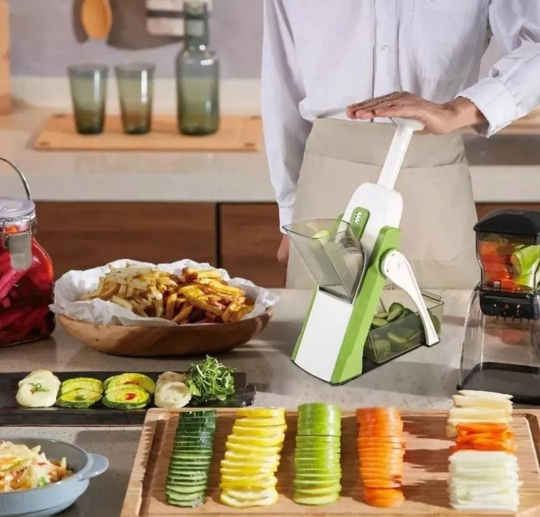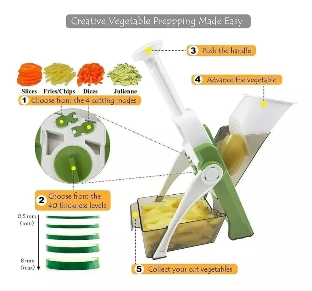 Características:1. Caja de contenedor vegetal desmontable, fácil de lavar después de usar;.2. Calidad y funcionalidad compatibles3. Comidas rápidas y saludables, ideal para hacer cortes franceses perfectos con Cualquier verdura, inserto para hacer patatas fritas sabrosas o aperitivos de zanahoria saludables. Puede decorar comidas como un verdadero chef o hacer los platos más divertidos para los niños, y con la cortadora clásica, cortar cebollas o ajo en poco tiempo o preparar las mejores ensaladas de jardín.4. Adiós a las encimeras desordenadas-ya no tiene que preocuparse por que las rodajas caigan por todas partes, lo que hace un gran desorden.5. Calidad A un gran precio-El Mandoline Pro te ahorrará energía, tiempo y dinero preparando las comidas más deliciosas y saludables que amas.6. El plástico ABS no es tóxico, lo que garantiza comidas 100% saludables para usted y su familia. Apto para lavavajillas y esterilizador de platos