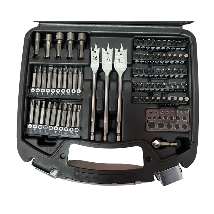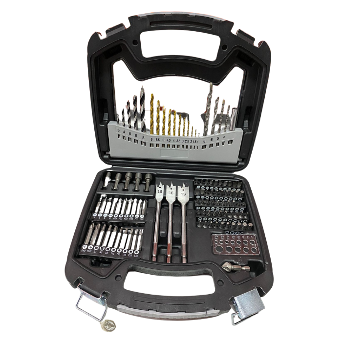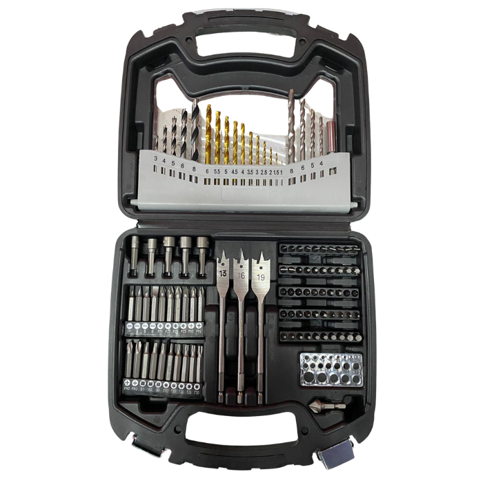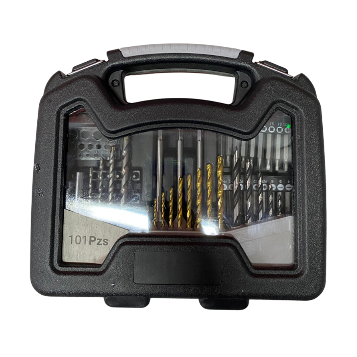 Juego De Brocas Y Puntas Con Caja De Herramientas 101 PiezasMaletín de plástico resistente con cierre deslizante seguro Todas las brocas de madera de metal y mampostería brocas largas y cortas en las tallas más populares para el uso rápido de la máquina taladro o broca cambios más rápidos con el bit o suministrados 11 mechas de acero rapido recubiertasen titanio4 mechas para concreto5 mechas para madera3 mechas paleta para madera50 puntas de 225mm de largo encactre 1420 puntas de 50mm de largo encastre 14